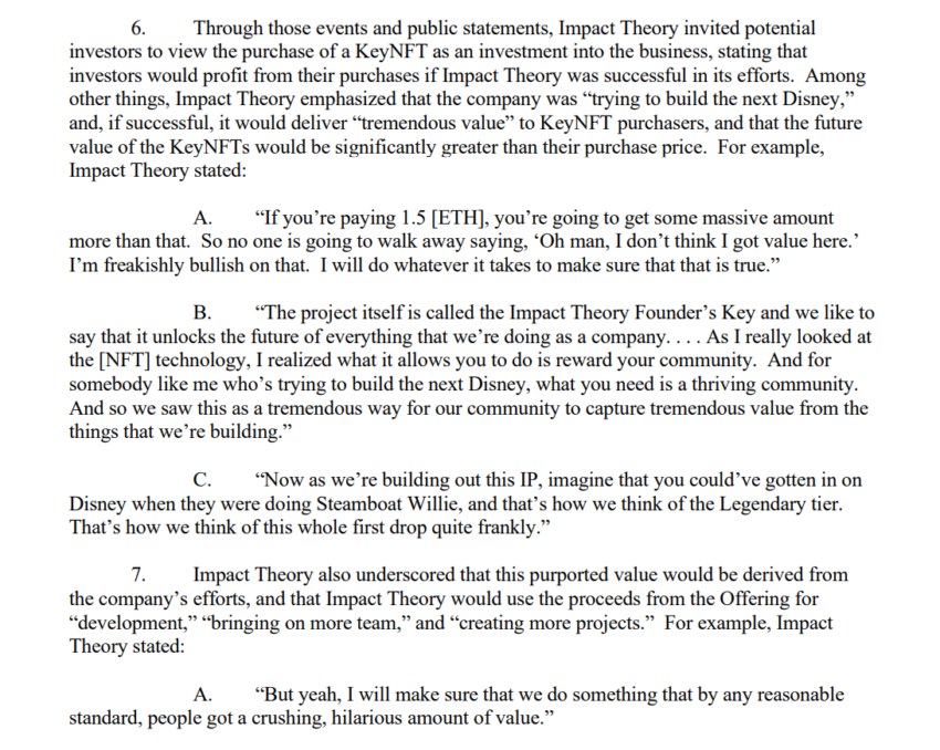 La teoria dell’impatto sembra aver facilitato notevolmente tali interpretazioni con il suo hype per le NFT. In una riga citata nell’ordine della SEC, Impact Theory ha dichiarato: