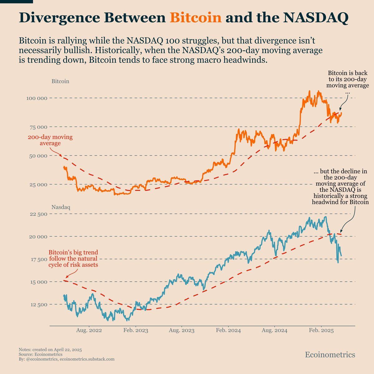 Ma ad aprile 2025, Bitcoin ha iniziato a mostrare una crescita indipendente. Non si muove più in sincronia con il NASDAQ. Mentre alcuni, come Ecoinometrics, sostengono che questa divergenza non sia necessariamente rialzista, Demeester rimane ottimista.