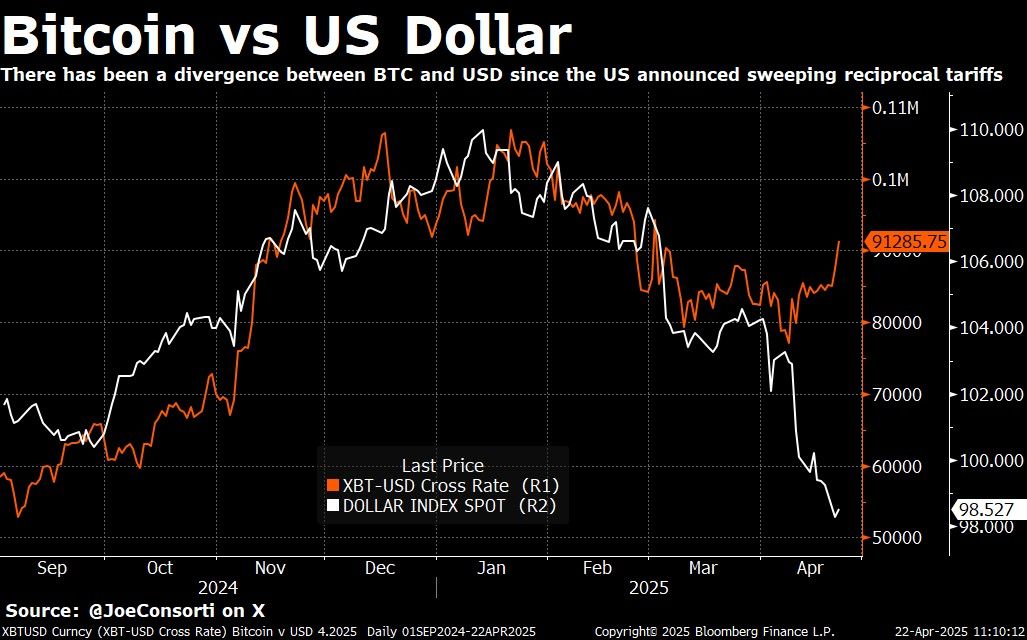 Joe Consorti, Head of Growth di TheyaBitcoin, ha notato che Bitcoin ha iniziato a separarsi dal dollaro USA dopo l’annuncio di dazi pesanti. Un grafico dal suo post mostra che ad aprile, mentre il DXY è sceso bruscamente da 103,5 a 98,5, Bitcoin è aumentato da circa $75.000 a oltre $91.000.