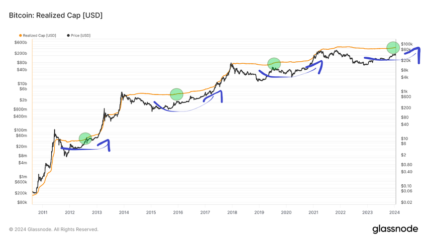 Attualmente, la capitalizzazione realizzata si sta dirigendo nuovamente verso l’alto. Ciò segnala un cambiamento nella tendenza a lungo termine ed è un forte segnale di un imminente mercato dei rialzisti. Questo indicatore, come la mappa del valore sulblockchain, storicamente cambia direzione intorno al dimezzamento del BTC.