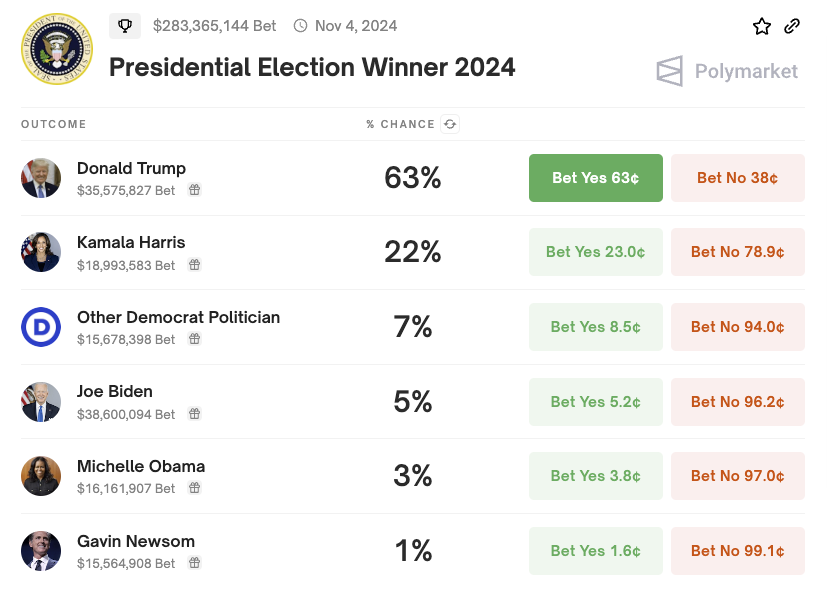 Il legame di Trump con le politiche pro-crypto ha probabilmente alimentato questo aumento. Nel frattempo, piattaforme di scommesse come Polymarket continuano a favorire Trump rispetto a Joe Biden, le cui quotazioni presidenziali sono scese in seguito a una recente diagnosi di COVID-19.