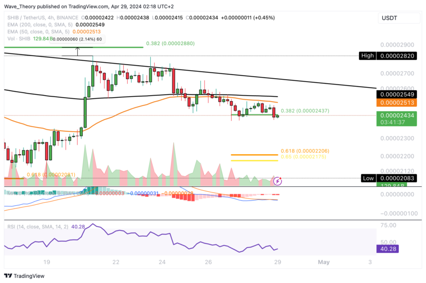 Shiba Inu ha recentemente violato il livello di supporto critico dell’EMA a 50 giorni, situato a circa 0,0000248$, ed è attualmente alla ricerca di un supporto sostanziale al livello di 0,0000244$ di 0,0000244$. Questo livello potrebbe fungere da piattaforma per un rimbalzo rialzista, potenzialmente mirando alla resistenza dell’EMA a 50 giorni.