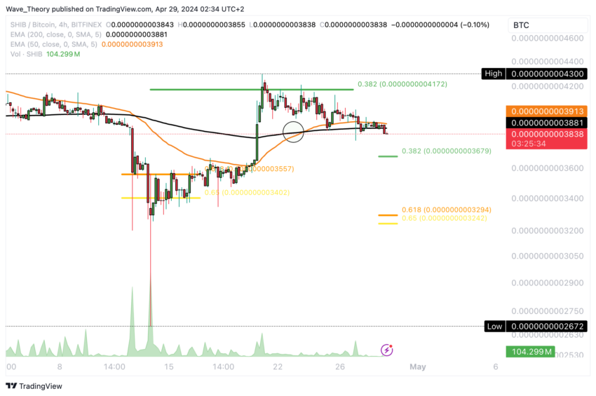 Nel grafico a 4 ore contro BTC, c’è un golden crossover in corso, ma questo potrebbe trasformarsi in un death cross a breve. Shiba Inu sembra pronta a continuare la sua traiettoria correttiva, puntando potenzialmente verso il livello di supporto di 0,382 Fibonacci.