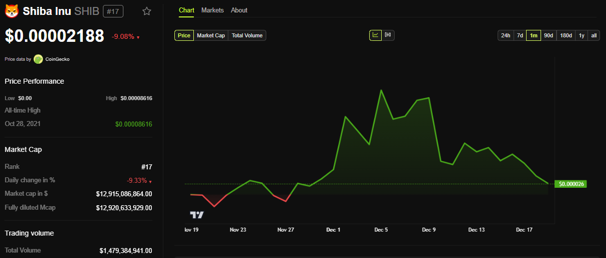 Nonostante questo sviluppo, il token nativo di Shiba Inu, SHIB, è sceso di quasi 10%, attualmente scambiato a 0.00002188 USD.