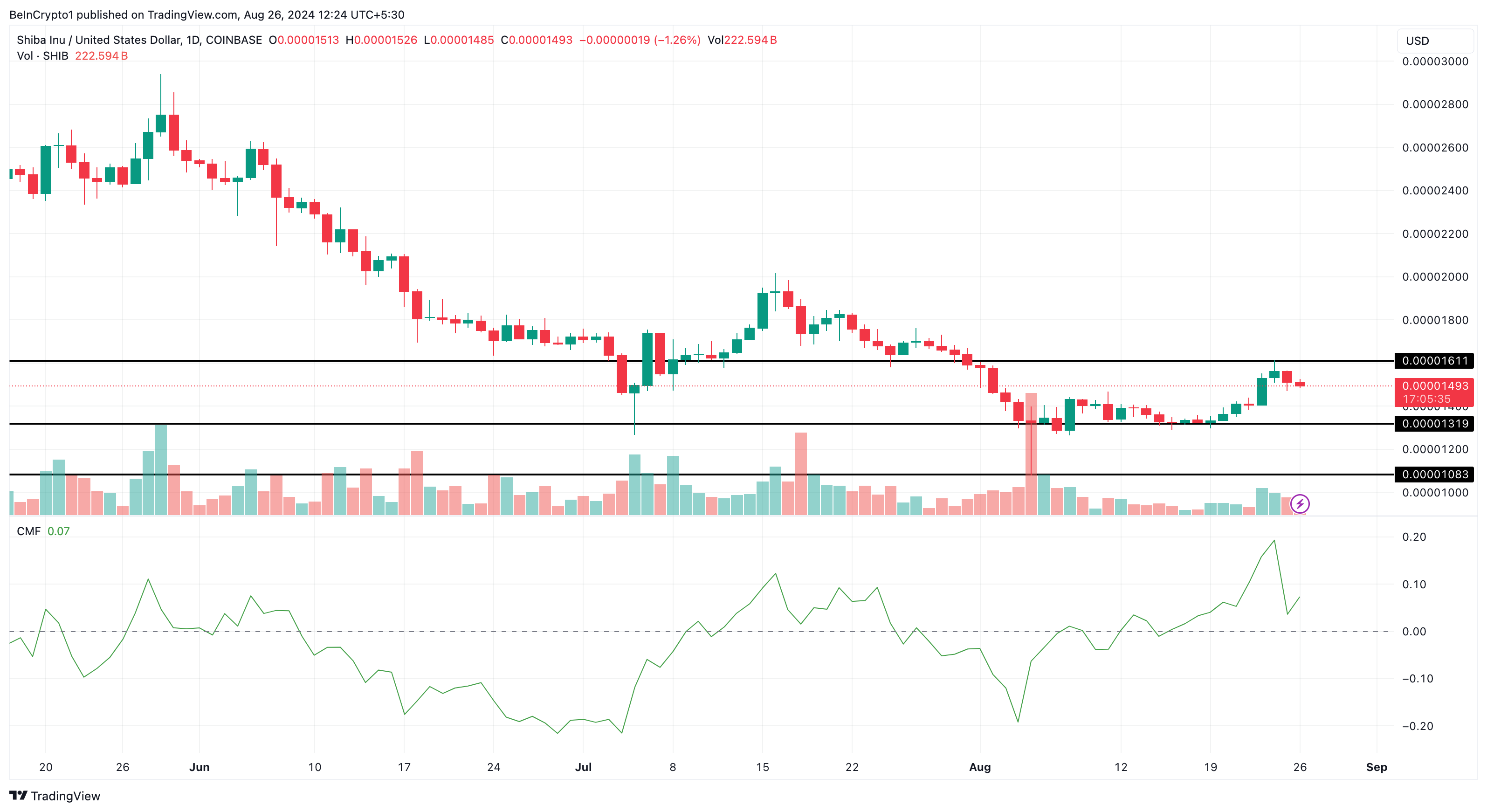 Da un punto di vista tecnico, il prezzo di SHIB continua a mostrare segni di fragilità, soprattutto se persistono i problemi di liquidità. Il grafico giornaliero rivela un calo dell’indicatore Chaikin Money Flow (CMF), che misura l’attività di scambiare sul mercato per misurare l’accumulo rispetto alla distribuzione.
