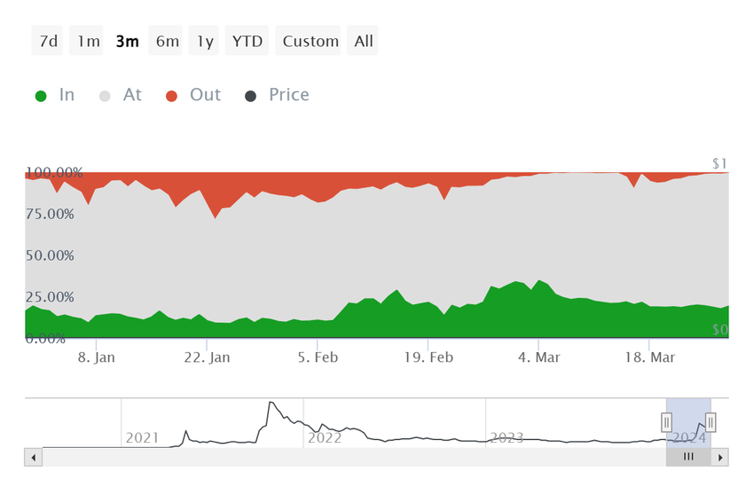 Inoltre, la moneta meme osserva anche la convinzione degli investitori al dettaglio. Gli indirizzi attivi per redditività evidenziano se gli investitori che partecipano alla rete sono dentro, dentro o fuori dal denaro.
