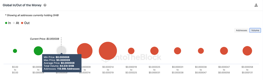 Come si vede nel grafico sottostante, 118.980 possessori hanno acquistato 64,03 trilioni di SHIB al prezzo medio di 0,000008 dollari. I tori potrebbero tentare un rimbalzo da questa fascia se continueranno ad accumulare ordini di acquisto.