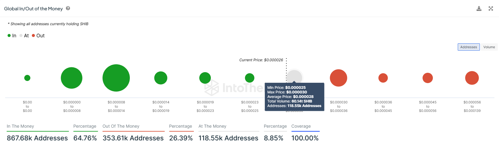 Secondo Global In/Out of the Money (GIOM), questa offerta è stata acquistata tra $ 0,00002500 e $ 0,00003000. Affinché gli investitori di Shiba Inu possano assistere a questi guadagni, la meme coin dovrebbe registrare un aumento del 19% rispetto al prezzo di negoziazione. Ciò richiederebbe una massiccia spinta sia da parte degli investitori che da parte di segnali di mercato più ampi.