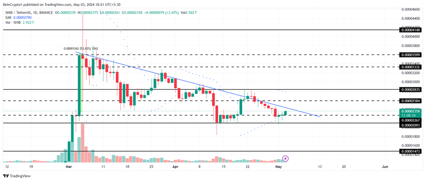 Il prezzo di Shiba Inu è stato scambiato sotto una linea di tendenza al ribasso per la maggior parte dall’inizio di marzo. Anche se la meme coin ha tentato breakout in passato, non è riuscita a mantenere il rally.