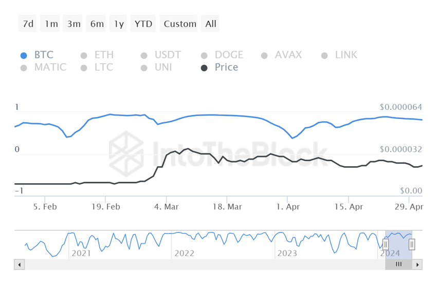 Inoltre, la correlazione che questa meme coin condivide con Bitcoin minaccia anche i suoi guadagni. SHIB condivide un’alta correlazione di 0,81 con BTC. Un’elevata correlazione indica una forte relazione statistica tra i due asset. Ciò implica che i cambiamenti in uno di essi sono strettamente associati ai cambiamenti nell’altro.