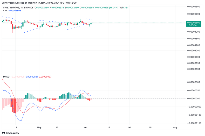 Inoltre, le letture dell’indicatore Moving Average Convergence Divergence (MACD) di SHIB hanno rivelato un’intersezione al rialzo della linea del segnale (rossa) con la linea MACD (blu) il 2 giugno. Questo incrocio è un segnale ribassista, che suggerisce che la media a breve termine di SHIB è scesa al di sotto della sua media a lungo termine.