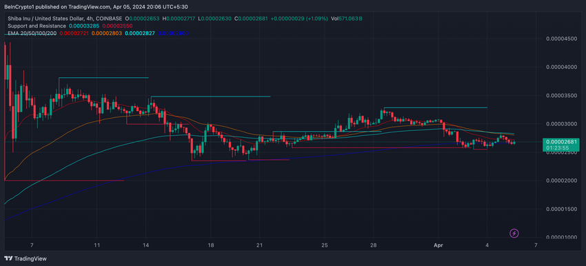 L’RSI ha avuto una tendenza all’ipercomprato, ma di recente ha mostrato una diminuzione da 90 a 78. Questa riduzione dell’RSI, pur indicando ancora condizioni di ipercomprato, suggerisce un rallentamento dello slancio degli acquisti dietro Shiba Inu.