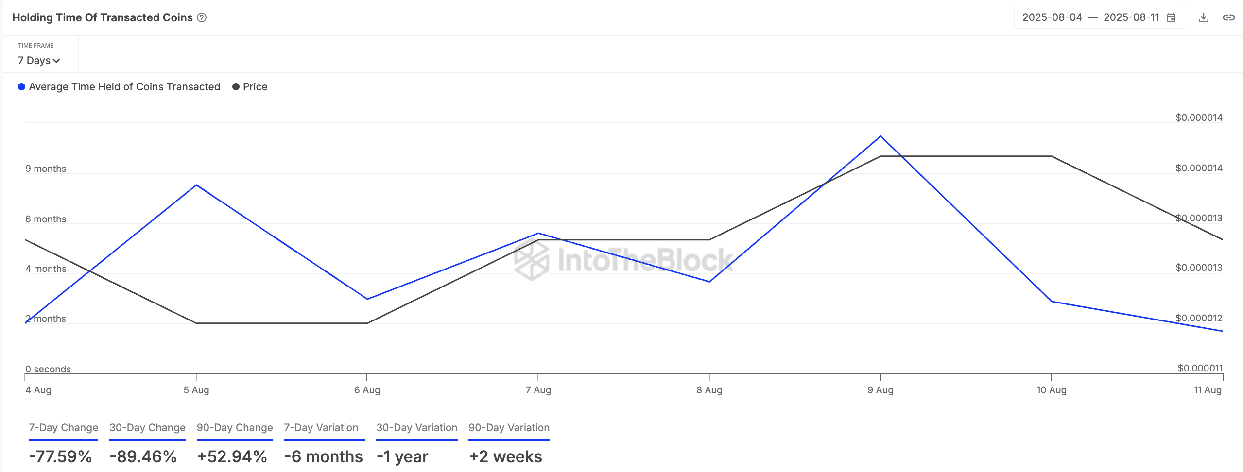 Gli investitori di SHIB hanno ridotto il loro tempo di detenzione, un chiaro segnale che il sentimento ribassista intorno alla meme coin sta crescendo. I dati di IntoTheBlock mostrano che il tempo medio di detenzione per i token SHIB transati è precipitato del 78% negli ultimi sette giorni.