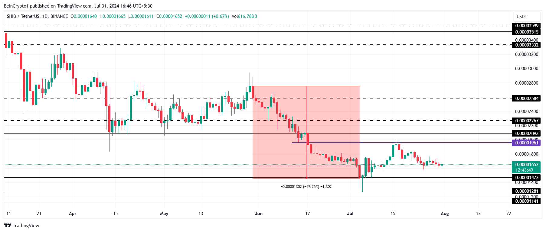 Dall’altra parte, se il supporto di 0,00001473 dollari venisse perso, questa tesi ribassista-neutrale verrebbe invalidata. Infatti, il prezzo di Shiba Inu diventerebbe vulnerabile a un calo a 0,00001281 dollari o meno.