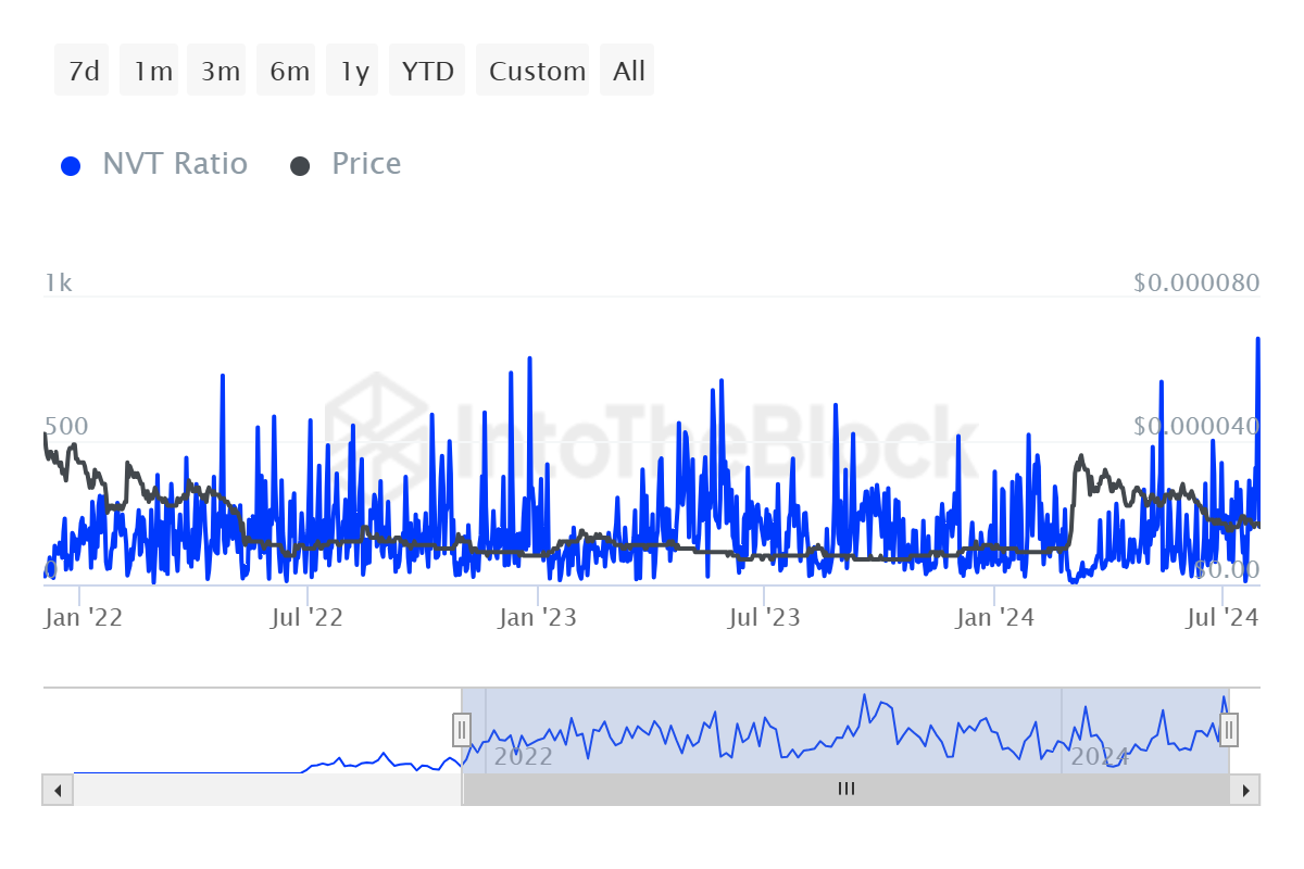 Il rapporto NVT (Network Value to Transactions) di Shiba Inu ha raggiunto il punto più alto in un anno e mezzo, suggerendo che SHIB potrebbe essere sopravvalutata. Il rapporto NVT è una metrica chiave utilizzata per valutare il valore di una criptovaluta rispetto al suo volume di transazioni.