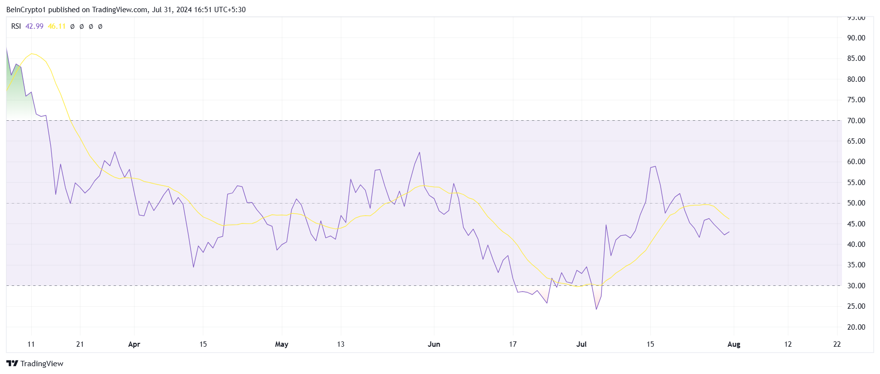 SponsoredOltre all’elevato rapporto NVT, l’Indice di Forza Relativa (RSI) di Shiba Inu non riesce a mantenersi nella zona rialzista. L’RSI è un indicatore di slancio che misura la velocità e la variazione dei movimenti dei prezzi.