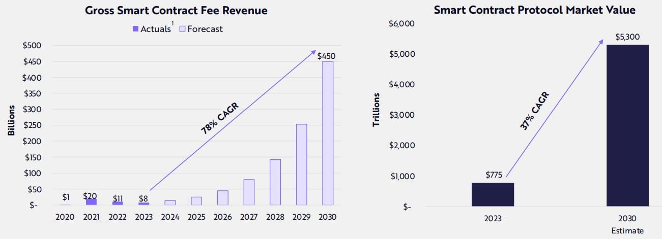 Nel suo rapporto di ricerca annuale “Big Ideas 2024”, Ark Invest ha previsto che i contratti intelligenti potrebbero generare oltre 450 miliardi di dollari di commissioni all’anno entro il 2030. Ciò potrebbe creare un valore di mercato di oltre 5.000 miliardi di dollari per le piattaforme di contratti intelligenti. Ciò avverrà se l’adozione di cripto e blockchain seguirà una traiettoria simile a quella di Internet.