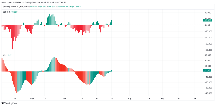Allo stesso modo, l’Awesome Oscillator di SOL presenta una barra verde rivolta verso l’alto al momento della scrittura. Questo indicatore misura lo slancio dei prezzi di un asset.