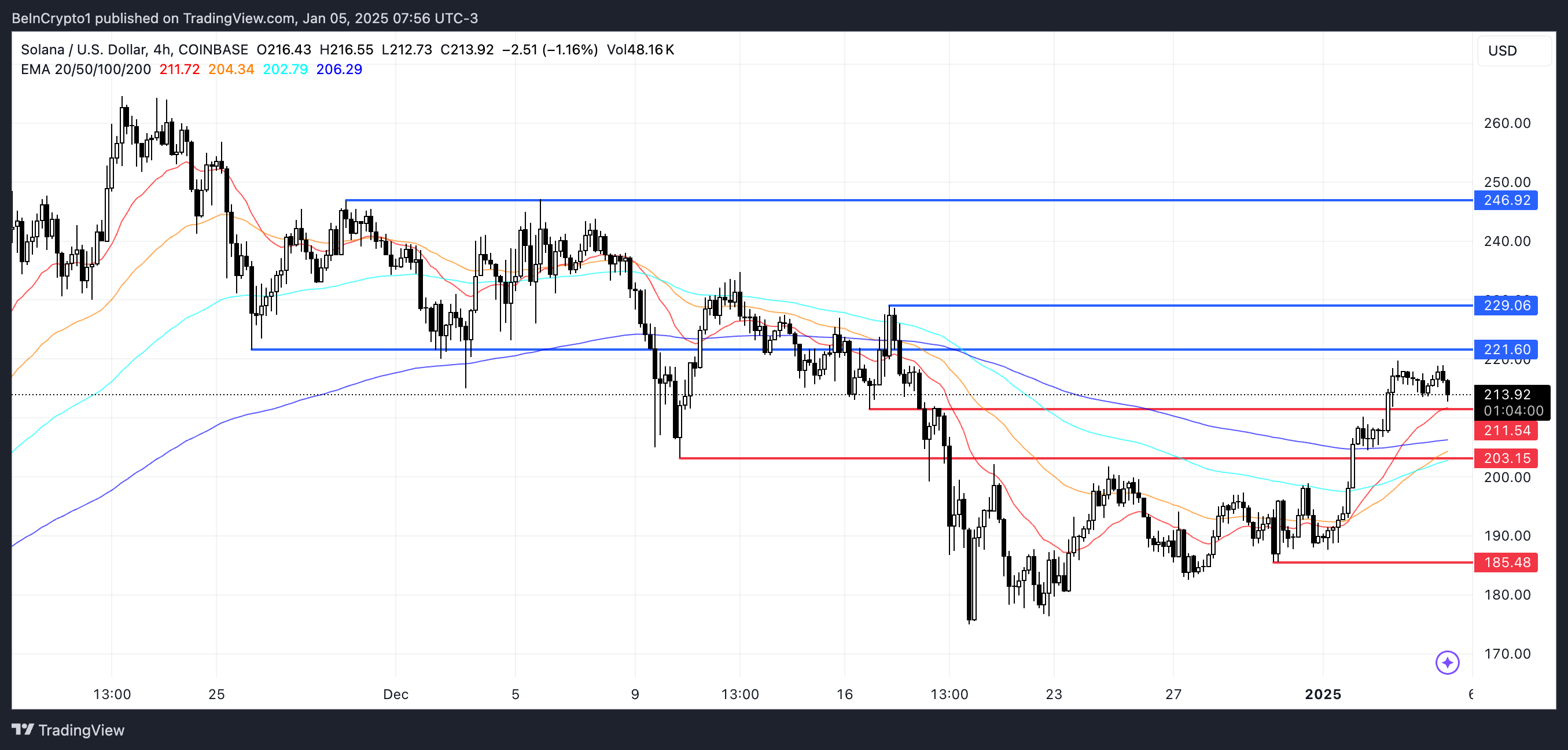 Il movimento del prezzo di Solana dipende dalla sua capacità di mantenere il livello di supporto critico a 211 USD. Se questo supporto viene perso, SOL potrebbe entrare in un trend ribassista, con 203 USD come prossimo livello chiave da osservare.