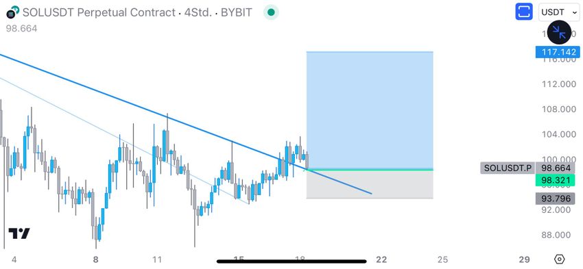 Nonostante la previsione ribassista sui prezzi di SOL, un breakout del triangolo significherà che il fondo locale è stato raggiunto. A quel punto, SOL potrà aumentare del 18% fino alla prossima resistenza a 117 dollari.