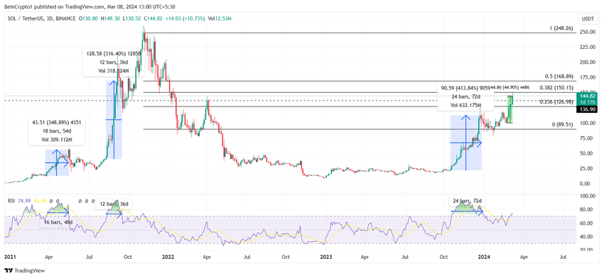 Il prezzo di Solana ha fatto scalpore nel mercato delle criptovalute verso la fine del 2023, dopo aver superato la soglia dei 100 dollari. Sebbene SOL stia ora scambiare a 144 dollari, ha ancora molta strada da percorrere per avvicinarsi a stabilire un nuovo massimo storico.