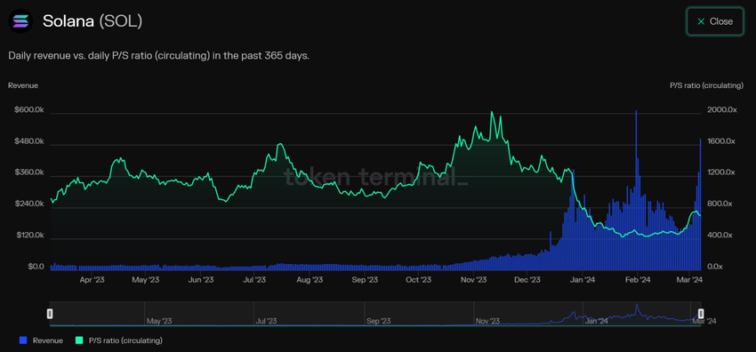 L’altcoin non ha aumentato il suo valore nemmeno durante i 12 mesi ribassisti tra la metà del 2022 e la metà del 2023. Tuttavia, verso la fine del 2023, le entrate generate dall’altcoin non sono riuscite a raggiungere la capitalizzazione di mercato in rapida crescita. Questo ha fatto sì che Solana fosse sottovalutata.