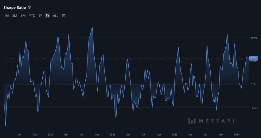 Lo Sharpe Ratio dell’asset è attualmente pari a 5,37, il valore più alto registrato dal dicembre 2023. Lo Sharpe Ratio misura il rendimento corretto per il rischio di un investimento o di un portafoglio di criptovalute. Mette a confronto il rendimento in eccesso della criptovaluta (rispetto a un tasso privo di rischio) con la sua volatilità.