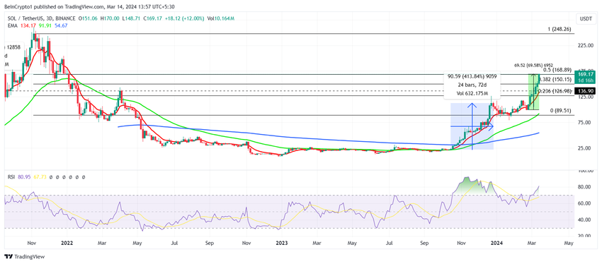 Ilprezzo di Solana, che scambia a 170 dollari, è vicino alla soglia dei 200 dollari, avendo già superato i livelli di resistenza. L’altcoin è sul punto di superare il 50% del ritracciamento di Fibonacci da 248 a 89 dollari. Questo livello rappresenta un’importante svolta rialzista per l’azione dei prezzi.