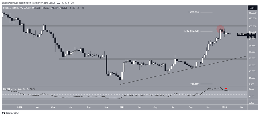 Il movimento al rialzo ha portato a un massimo annuale di 126 dollari nell’ultima settimana dell’anno. Il massimo è stato raggiunto appena al di sopra del livello di resistenza 0,382 Fib retracement. Da allora, tuttavia, il prezzo del SOL è sceso. Si è discostato al di sopra della resistenza Fib menzionata sopra (cerchio rosso).