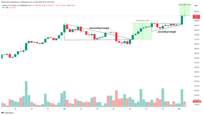 Secondo il grafico a 4 ore, il recente rialzo di Solana potrebbe essere collegato al breakout del triangolo discendente avvenuto il 26 luglio. Un triangolo discendente è un modello ribassista che mostra la continuazione di una tendenza al ribasso.