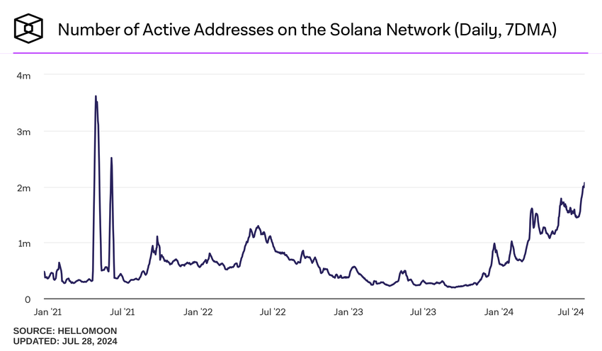 Al momento della stampa, gli indirizzi attivi giornalieri di Solana erano 2,07 milioni, a pochi metri dai 2,26 milioni raggiunti durante il mercato dei rialzisti del 2021.