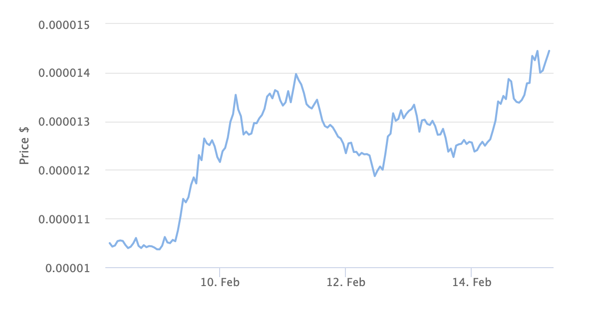 Al momento della pubblicazione, il prezzo di BONK è di 0,00001424 dollari. Negli ultimi 7 giorni ha registrato una crescita del 35%.