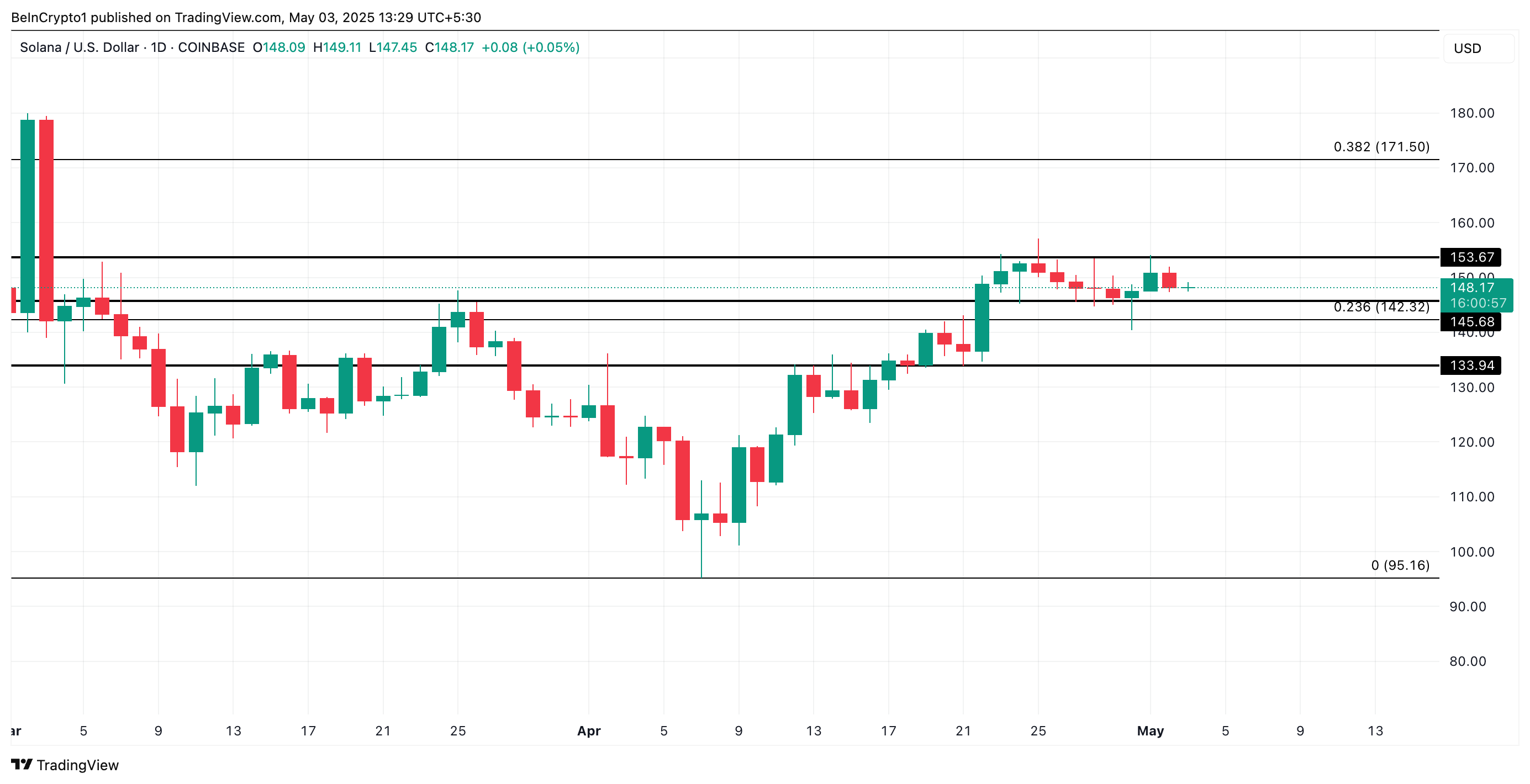 Dal 23 aprile, il prezzo di Solana ha oscillato all’interno di un intervallo di trading ristretto, affrontando resistenza vicino a $153,67 e trovando supporto intorno a $145,68.