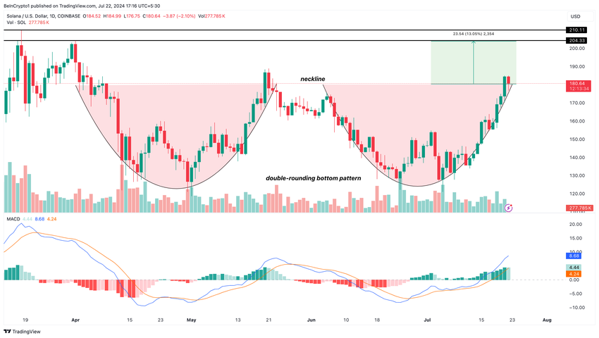 SponsoredIn genere, questo schema segna la fine di una tendenza ribassista e, con la neckline a 180,30 dollari, il prezzo di SOL potrebbe essere in linea per un breakout.