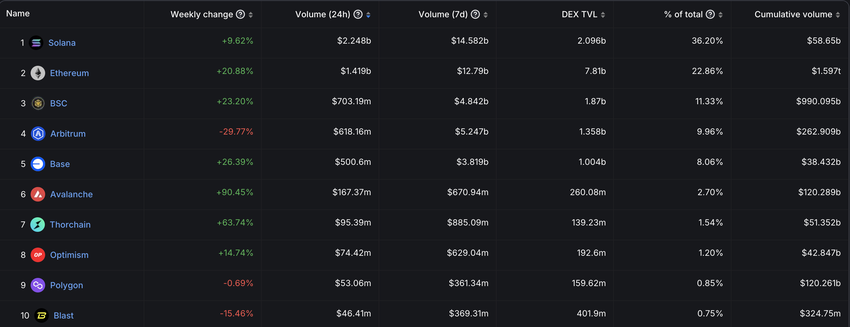 Sia Ethereum che BNB Chain hanno registrato incrementi settimanali più elevati, ma ciò non è bastato a far perdere a Solana il primo posto.