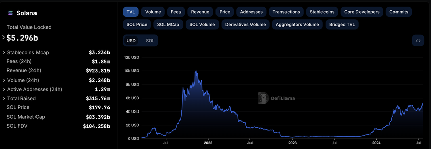 Il TVL si riferisce al valore degli asset bloccati o oggetto di interesse in un protocollo e misura la salute di una rete. Al momento della stampa, il TVL di Solana è di 5,29 miliardi di dollari, un valore superiore a quello raggiunto prima dell’inizio del mercato ribassista del 2022.