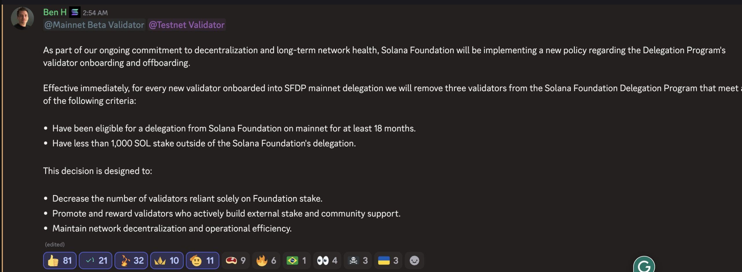 Il post ha ulteriormente dettagliato i criteri di rimozione. I validatori con meno di 1.000 SOL in stake esterno perderanno il loro posto. Inoltre, la Solana Foundation rimuoverà qualsiasi validatore che sia stato idoneo per una delega sulla mainnet per almeno 18 mesi.