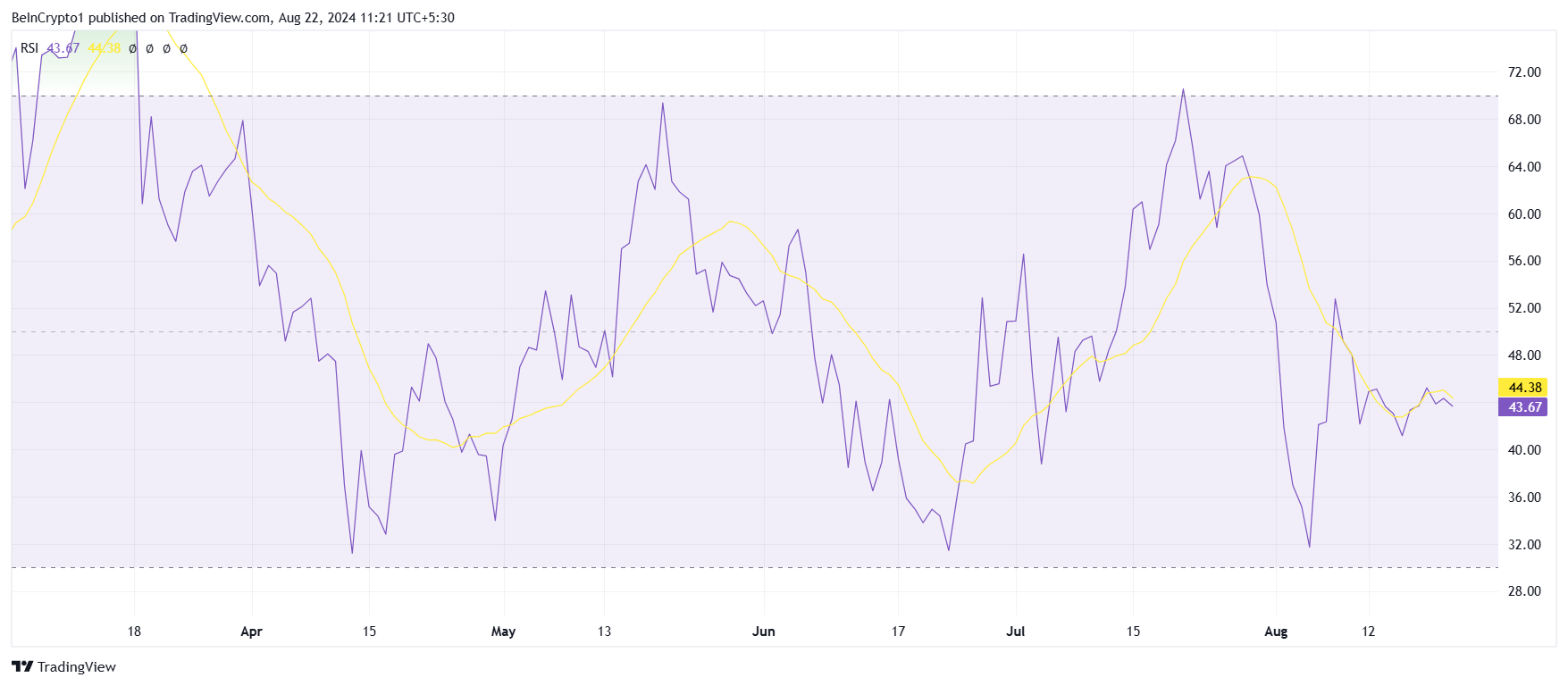 Questo ritiro potrebbe peggiorare l’atmosfera pessimistica che circonda il prezzo dell’altcoin, dato che gli spunti del mercato più ampio sono già negativi. Dopo aver sfondato la zona rialzista, l’Indice di Forza Relativa (RSI) è tornato sotto la linea neutra.
