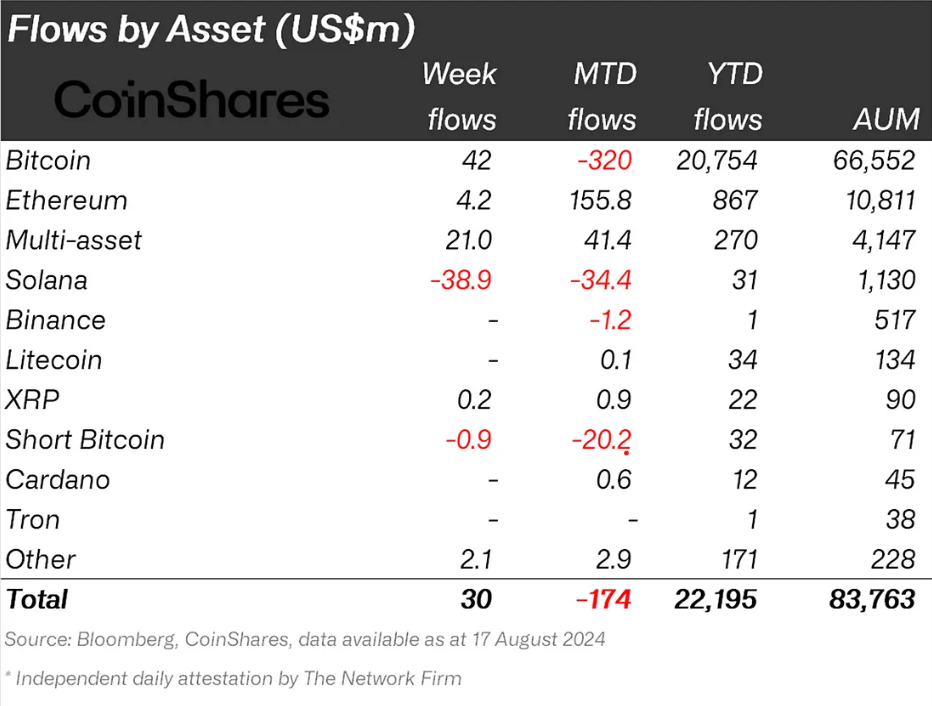 Secondo quanto riportato da CoinShares, nella settimana conclusasi il 17 agosto, SOL ha registrato deflussi per una quantità di 38,9 milioni di dollari. Questo ha fatto diminuire i flussi di Solana da un anno all’altro a 31 milioni di dollari rispetto a quelli di Litecoin.