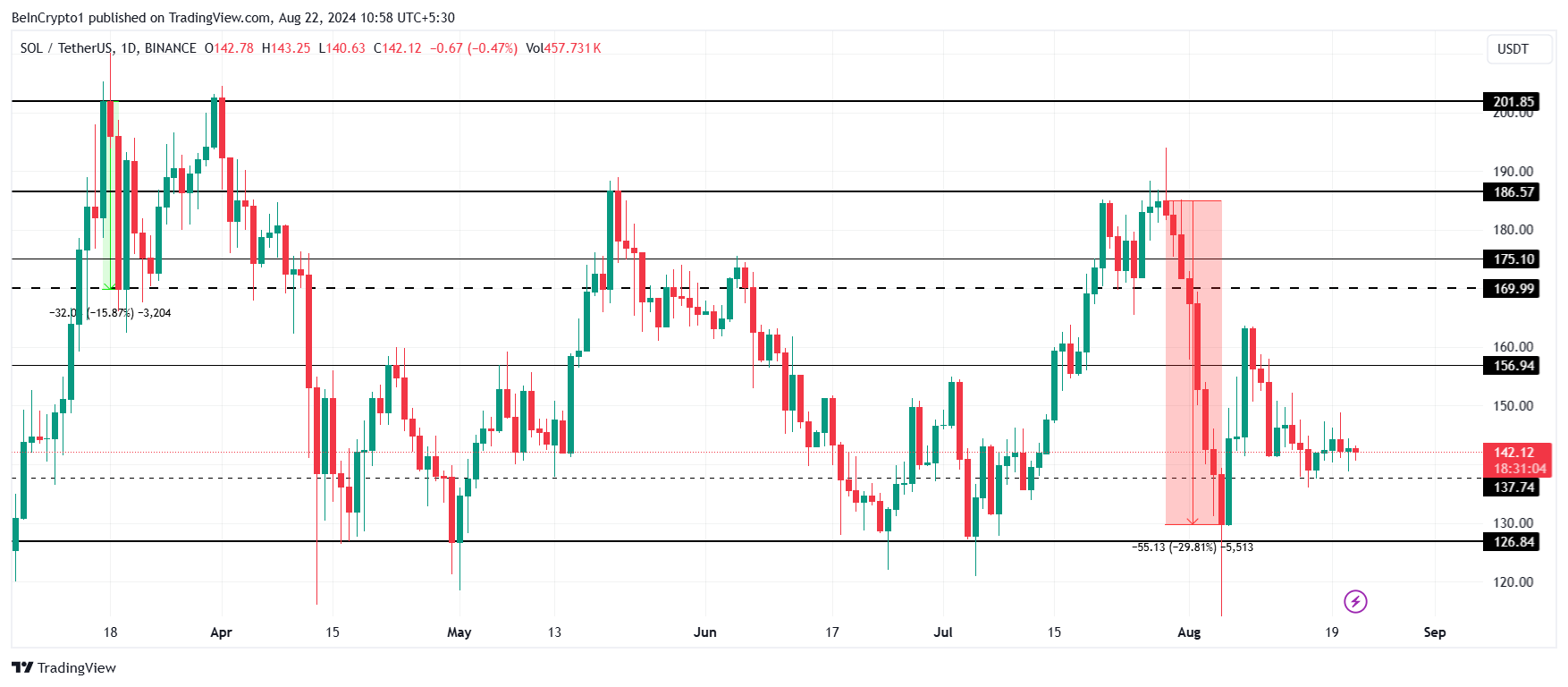 Il prezzo di Solana scambia intorno alla soglia dei 150 dollari a 142 dollari al momento della scrittura, mantenendosi al di sopra del supporto di 137 dollari. Il recupero a breve termine di SOL da 130 a 162 dollari all’inizio del mese è quasi fallito. È probabile che l’asset crittografico sia destinato a consolidarsi sotto i 156 dollari, come già accaduto in passato.