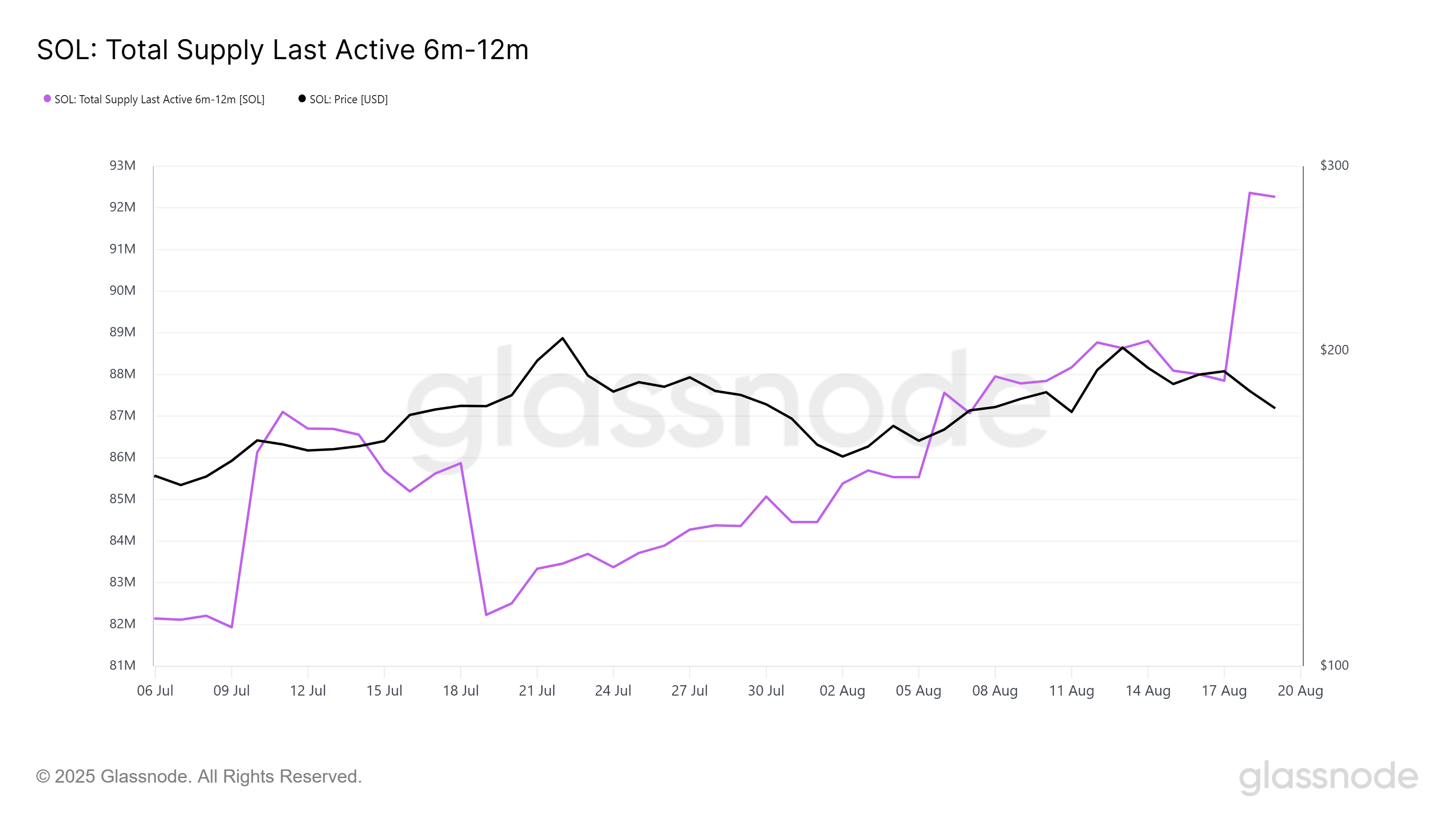 Nelle ultime 24 ore, la fornitura di Solana che era rimasta inattiva tra i 6 e i 12 mesi è aumentata di 5 milioni di SOL, valutati oltre $905 milioni. Questo aumento della fornitura indica che una parte significativa delle partecipazioni in token sta maturando e si sta spostando verso investimenti a lungo termine.