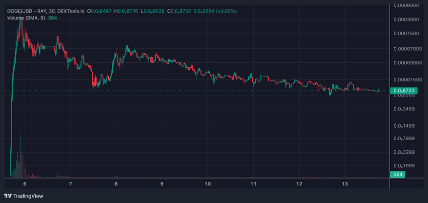 I dati di DEXtools mostrano che la capitalizzazione di mercato totale di Dogecoin è ora di 86.160 dollari, con una liquidità di 25.530 dollari e un volume di scambi di 60.000 dollari nelle 24 ore.