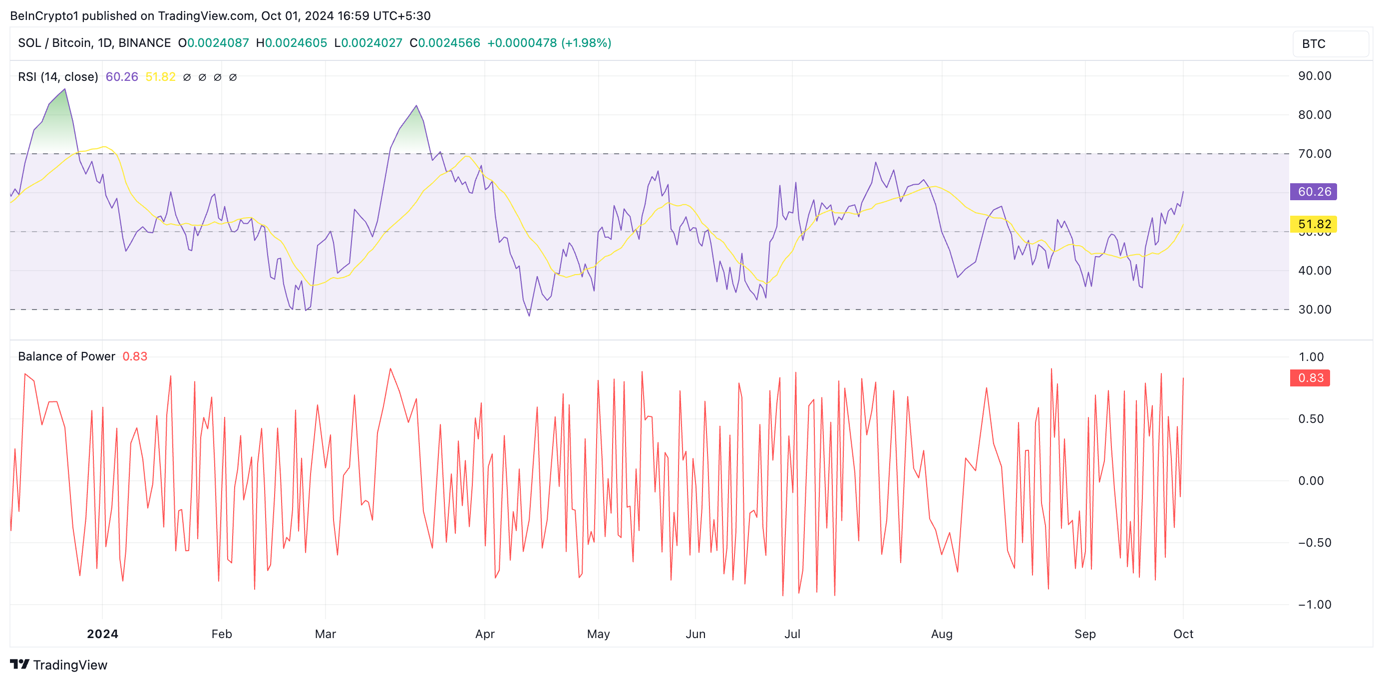 Il BoP di SOL/BTC, che misura il rapporto tra le pressioni di acquisto e vendita nel mercato, è 0,8 al momento della stampa. Quando questo indicatore è positivo (sopra zero), la pressione di acquisto è più forte di quella di vendita nel mercato. Indica che ci sono più acquirenti che venditori, spingendo il prezzo verso l’alto.