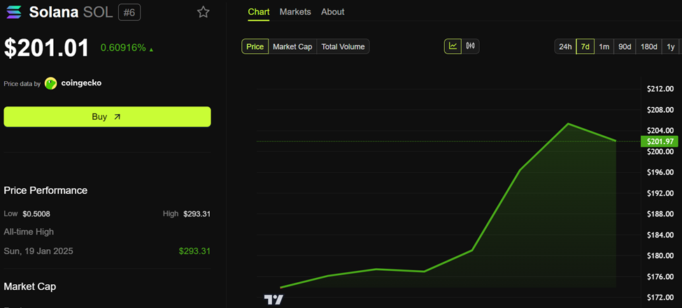Solana è aumentata di oltre il 20% nell’ultima settimana e di un modesto 0,609% nelle ultime 24 ore. Al momento della stesura, SOL era scambiata a $201,01, con il mercato delle altcoin generale che riaccendeva le speranze rialziste tra gli investitori.