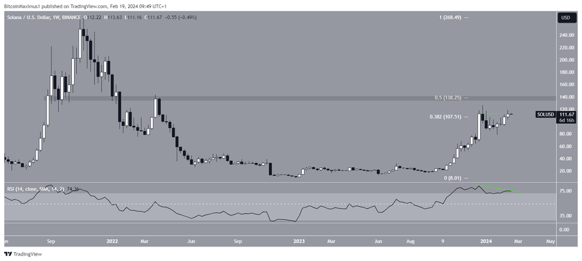 Da allora il prezzo di SOL è aumentato, creando candele settimanali rialziste successive. Ha raggiunto un massimo di 119 dollari il 14 febbraio 2024.