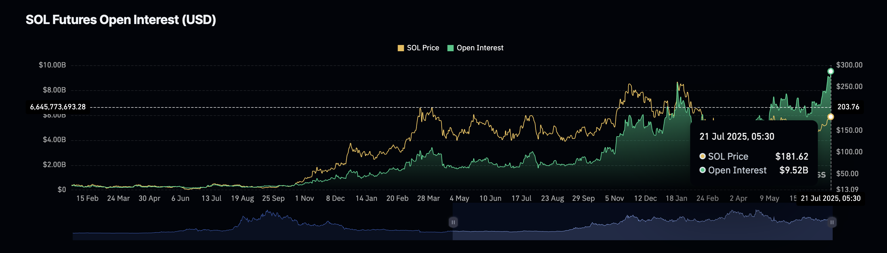 Più importante, l’open interest (OI) è aumentato, superando i 9,52 miliardi di dollari, il livello più alto da mesi. Questo aumento dell’OI, mentre il prezzo di SOL aumenta anche, suggerisce che nuovi capitali stanno entrando in posizioni long. In poche parole, i trader non stanno solo seguendo un vecchio trend; stanno scommettendo su ulteriori rialzi.