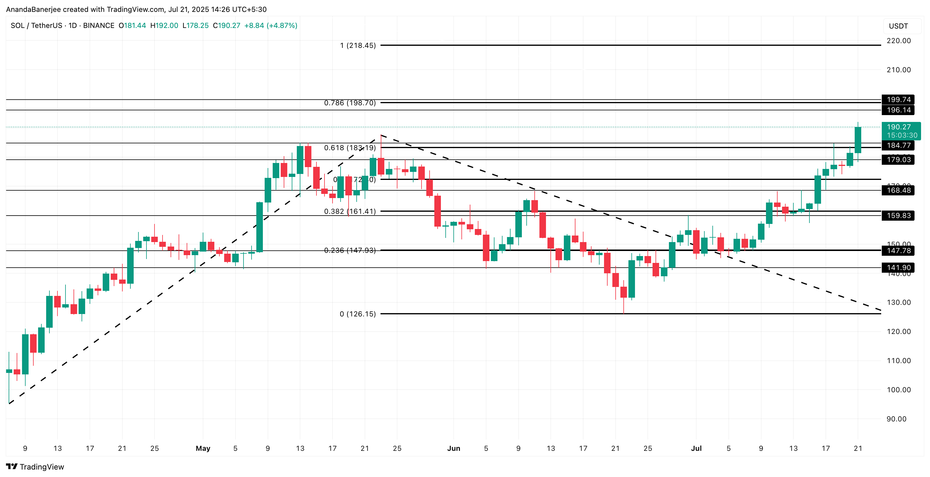 Il prezzo di Solana è attualmente scambiato a $190, trasformando i precedenti livelli di resistenza di $183 e $184 in supporto. Al momento, esiste una forte resistenza a $196, $198 e $199.