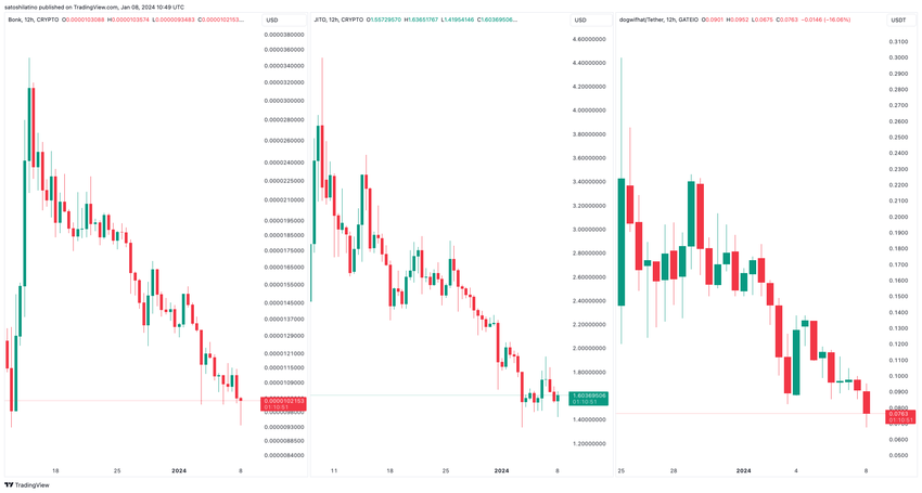 Anche lafrenesia iniziale per le monete meme sulla rete Solana è diminuita. Token come JTO, BONK e Dogwifhat, che avevano registrato aumenti vertiginosi del loro valore, stanno ora subendo cali sostanziali.