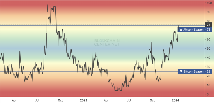 L’indice della stagione delle altcoin ha recentemente raggiunto un massimo di 76 su 100. Superando quindi la soglia critica di 75. Questo rialzo segna l’inizio ufficiale della tanto attesa stagione delle altcoin.