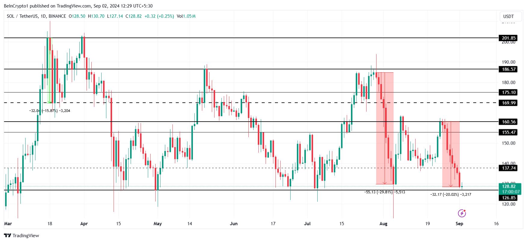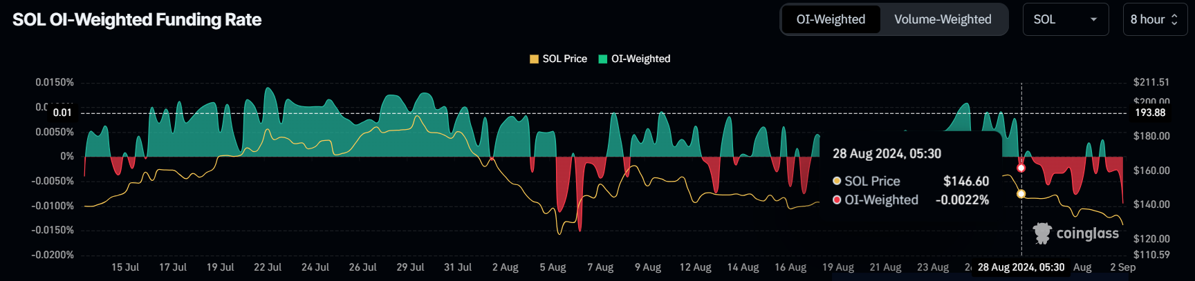 I trader di SOL erano largamente preparati per un calo del prezzo di Solana, specialmente quando il tasso di finanziamento è passato da positivo a negativo intorno al 28 agosto. Questo cambio indicava che i trader scommettevano su ulteriori cali, prevedendo una discesa a 126 USD. Dato che la consolidazione dell’altcoin è diventata un modello, il sentiment negativo non era arbitrario.